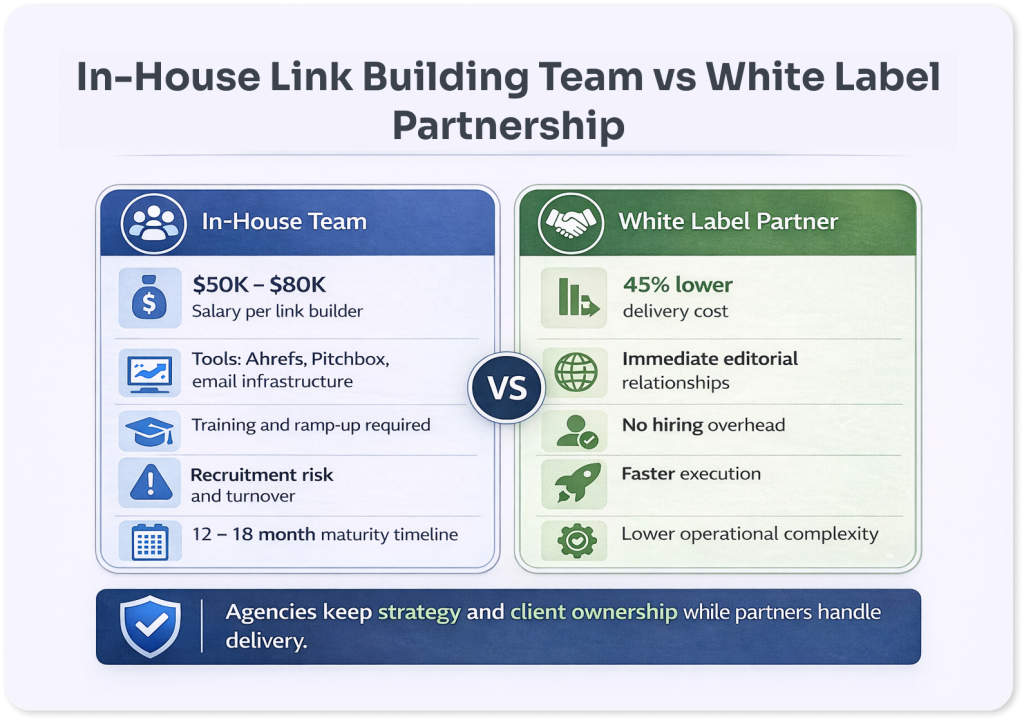 A white label link building partnership delivers the same or better output at a fraction of this cost, with the added benefit of eliminating recruitment risk, reducing operational complexity, and providing immediate access to capabilities that take years to build internally.