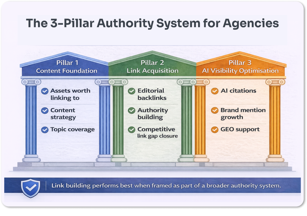 Position link building within your agency retainer as part of a three-pillar authority system: